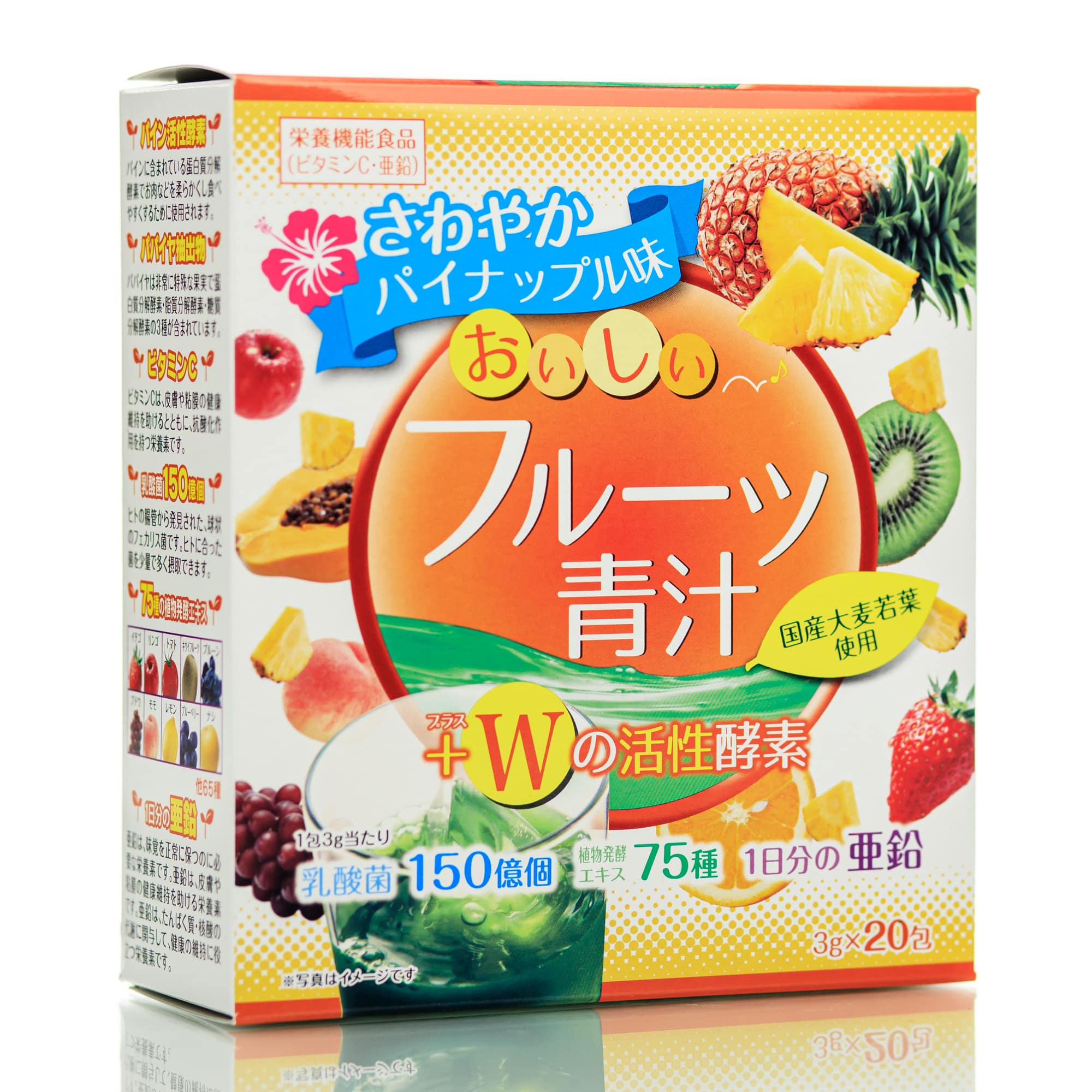 В составе порошок молодых листьев ячменя, порошок ананасового сока, экстракт ферментированных растений (капуста, клубника, яблоко, редис, томат, юзу, устрица, киви, огурец, баклажан, Шпинат, Комацуна, Горошек, Сельдерей, Горькая тыква, Перилла, Морковь, Чернослив, Йомоги, Соя (не гмо), Персик, Микан, Тыква, Рейши, Женьшень Нихоньяма, Кале, Молодые листья ячменя, Морохейя, Гребень, коричневый рис, кукуруза, кинкан, шиитаке, рисовые отруби, лимон, какао, киви, вакаме, хибамата, корень комбу, черника, акеби, ямамомо, красные морщины, обако, кумазаса, сугина, лист бива, майтаке, хидзики, груша, Чингенсай, Умэ, Ренкон, Укон, Иёкан, Витаминная зелень, Инжир, Виноград Яма, Гобо, Брокколи, Имбирь, Карин, Петрушка, Спаржа, Сери, Киви, Мицуба, Ежевика, Зимняя клубника, экстракт папайи, тыква / витамин С, глюконат цинка, компонент яблок / киви / соя 0,03 г, углеводы 2,56 г, эквивалент соли 0,008 г, витамин C 100 мг, цинк 8. 8 мг, 15 миллиардов молочнокислых бактерий, 30 мг порошка ананасового сока, 10 мг экстракта папайи, 10 мг порошка экстракта ферментированных растений.