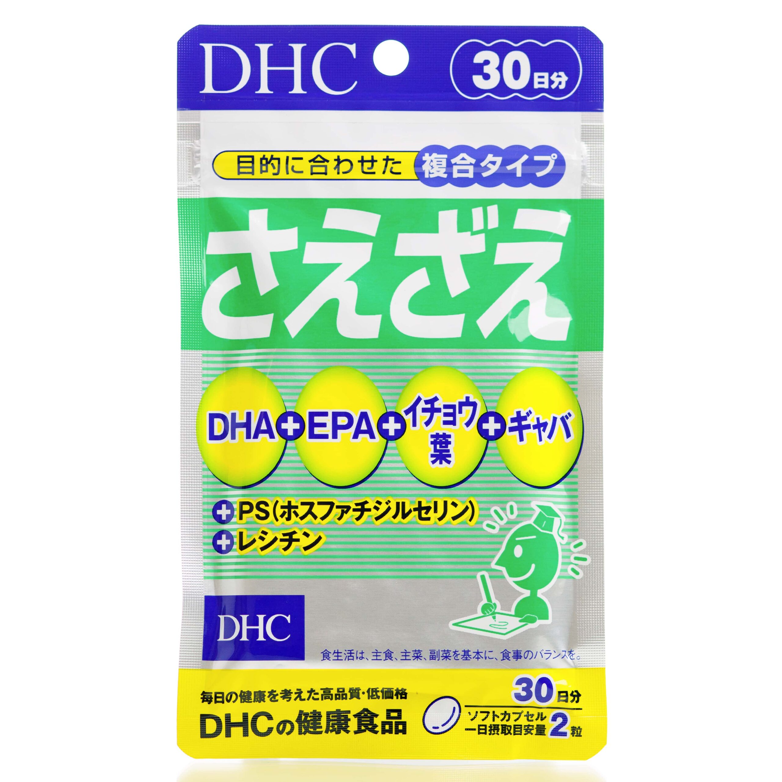 Комплексная добавка DHC Saezae содержит шесть ингредиентов, таких как DHA, PS, экстракт гинкго билоба и ГАМК. Поддерживает концентрацию, ясность ума, память.